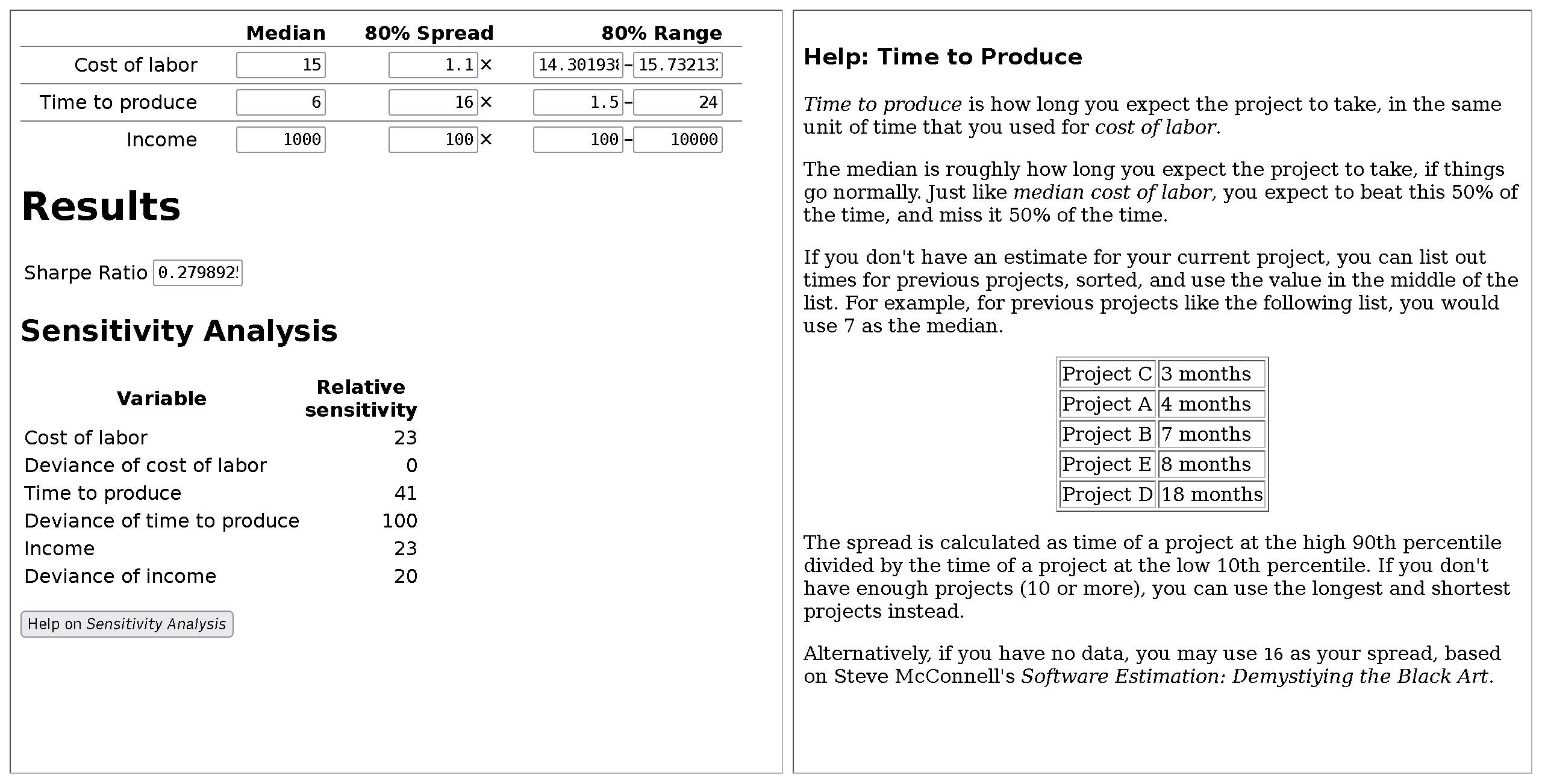 The app allows the user to enter the most important quantities about a software project (cost, time, utility), along with uncertainty factors for each.